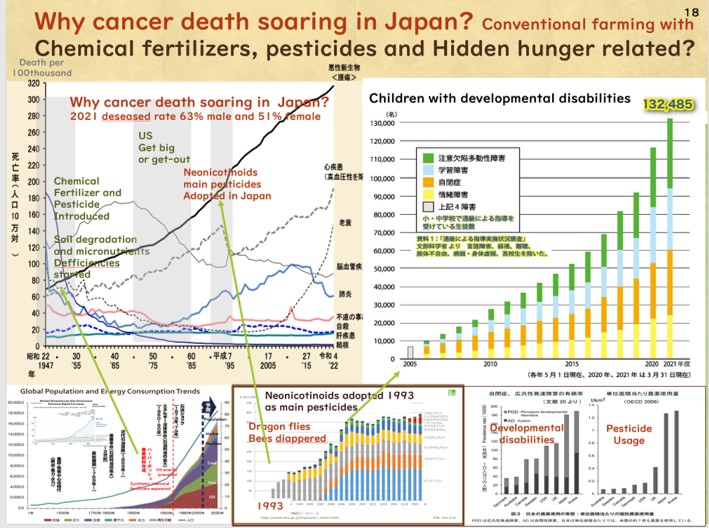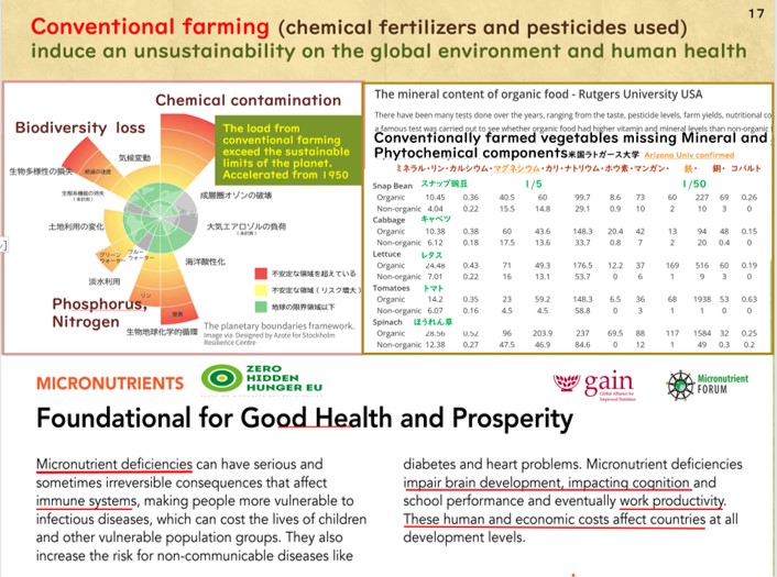 3.化学肥料・農薬の慣行農法による作物から微量栄養素や抗がん物質のファイトケミカルが欠落し、免疫機能低下との関係が排除できない。