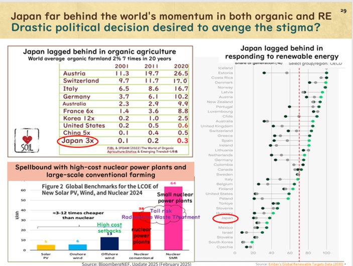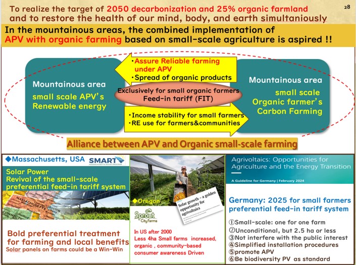 5.農産物生産の4割を担う中山間のコニュニティ維持と国民の健康回復と気候危機対応のためにも、有機農法に親和的な小規模農家と営農型ソーラーを合体する専用の固定価格買取制度(FIT)を復活することで、2050年の有機農地25%と炭素排出ゼロ目標達成を目指すなら、営農型ソーラーでの営農不備の問題を含め様々な課題が一気に同時解決できるのではないか。